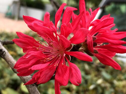 キクモモ(菊桃)はバラ科サクラ属の落葉小高木。ハナモモの一品種で、名前は花弁が細長くキクに似ていることに由来。別名はゲンジグルマ(源氏車)。濃い紅色の八重咲き。花期は3月下旬から1か月ほど。ハナモモの品種である「照手桃」、「源平枝垂れ」など…