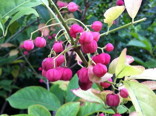 ニシキギ科のマユミ(檀、真弓、檀弓)の別名はヤマニシキギ(山錦木)。マユミは山地に自生するニシキギ科の落葉樹。近くの植え込みのマユミがコムラサキと同じように薄赤い実をたくさんつけています(画像)。マユミは実と種子だけでなく、紅葉も楽しむ庭…