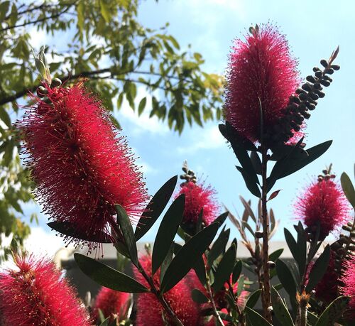 ブラシノキは「ブラシの木」のことで、花の形がビン洗いの円筒形のブラシそっくりです。私などは柔らかい筆に対して、堅いブラシを想像して、そのブラシの中に飛び込む昆虫や鳥は勇気があると思ってしまうのですが、どうもそれは素人の誤解のようです。 フト…