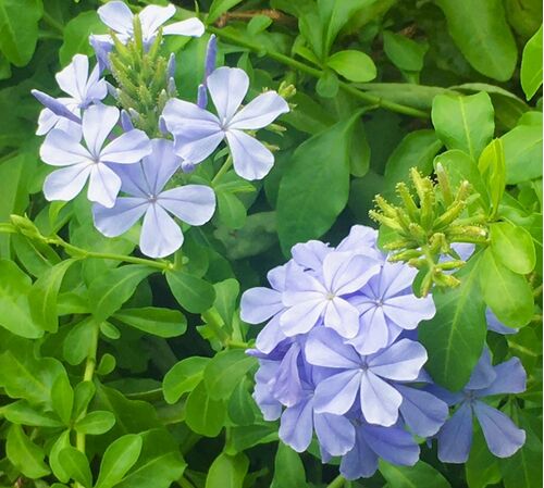 イソマツ科のプルンバゴ(Plumbago auriculata)の和名は「ルリマツリ」。ルリマツリは丈夫で育てやすい熱帯花木で、涼しげな青色の花が暑い夏には清涼感を与えてくれます。初夏から晩秋まで長期間にわたって次々と開花します。寒さにも強く、東京でも戸外で…