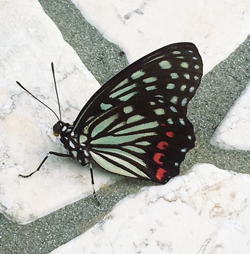関東地方では近年アカボシゴマダラが増えています。1990年代に関東地方に出現し、あっという間にその勢力を拡大しました。これに近い在来種がゴマダラチョウですが、こちらは白と黒だけの純和風の地味な装いです。それに対して、アカボシゴマダラの夏型は華…