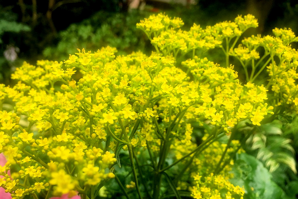 もち米でたくごはん(おこわ)が「男飯」であるのに対し、「粟(あわ)ごはん」のことは「女飯」で、花が粟つぶのように黄色くつぶつぶしていることから「女飯」→「おみなえし」となった、という説がある。漢字で「女郎花」と書くようになったのは平安時代のなかば頃から、と言われている。オミナエシもオトコエシも共にオミナエシ属で、交配可能となれば、でき上がるのが男女郎花。今なら、女男郎花か。