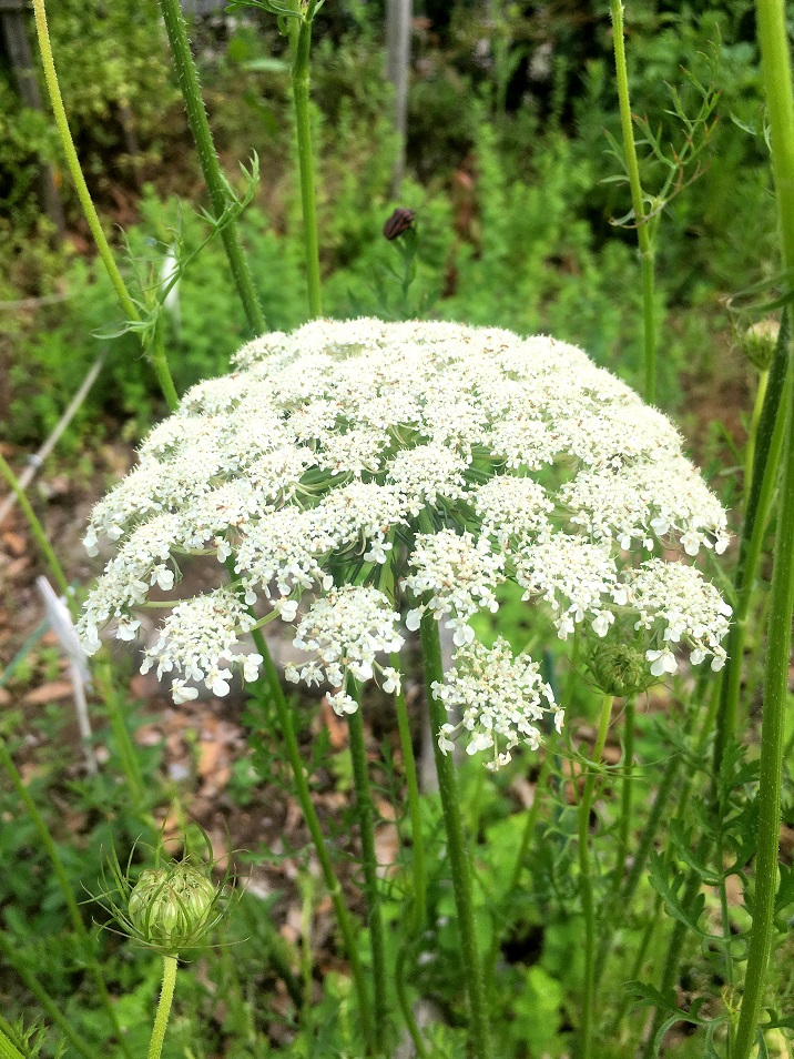 よく似た花にホワイトレースフラワー、レースフラワー(ドクゼリモドキ)があります。白い繊細な小花がふんわりと集まって咲く豪華なレースのような花姿から名前がつきましたが、別物です。また、よく似たノラニンジンは「ブラックレースフラワー」や「クイーンアンズレース」とも呼ばれている雑草で、こちらは葉や根、花など全草が食用として利用できます。ノラニンジンは、6月〜9月にかけて白色の花を咲かせます(画像)。