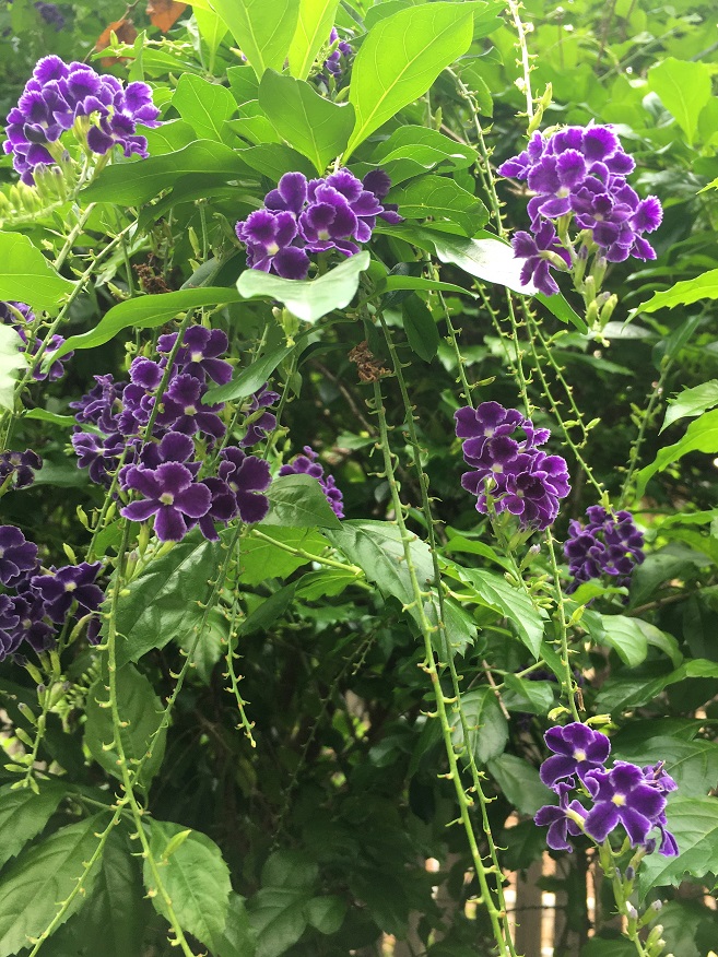 デュランタはクマツヅラ科デュランタ属の植物で、和名はハリマツリ、タイワンレンギョウ。花色が濃い青紫で、白い縁取りが入るものは「タカラヅカ」と呼ばれる品種(画像はデュランタ・タカラズカの花と実)。