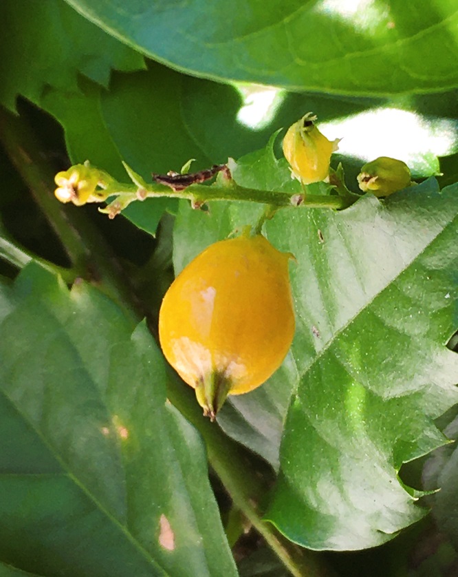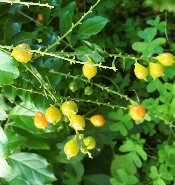 デュランタは花の後でオレンジ色の実(漿果)をつけ、そのため、中国では金露花と呼ばれる。この実は花とは違った味わいがあるが、この実自体は有毒である。