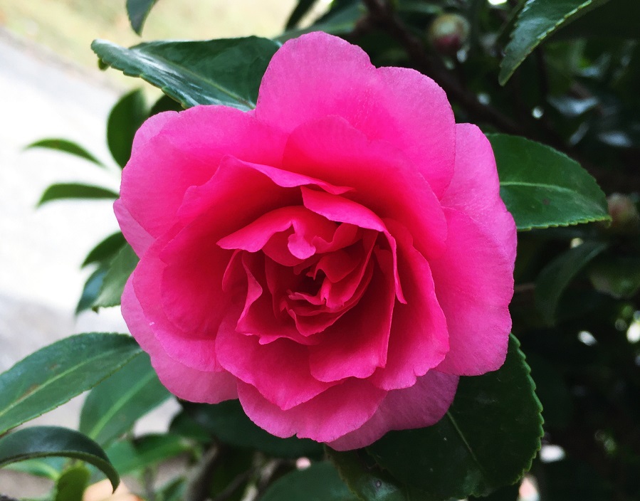 ツバキとは葉も花も似ていて、なかなか見分けがつきません。そこで、見分け方を三つ挙げてみましょう。まず、秋に咲き始めるのがサザンカ、少し遅れて冬になって咲き始めるのがツバキです。サザンカの葉は、ツバキと比べると一回り小ぶりで、葉の付け根部分にあたる葉柄に細かい毛が生えているのがサザンカ、毛が生えていないのがツバキです。最後に、ツバキの花は、そっくり丸ごと落ちるのに対し、サザンカの花は花弁がバラバラになってそれぞれ散っていきます。