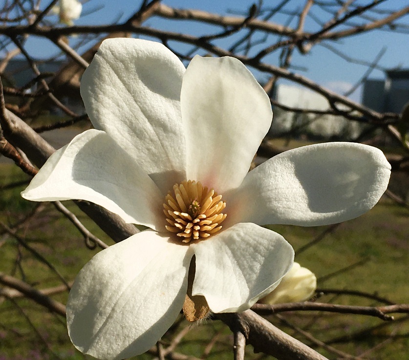 昨日ハクモクレンについて述べましたが、そのハクモクレンに似たコブシ(辛夷、拳)の花もやはり満開です。コブシはモクレン科モクレン属の落葉広葉樹で、北海道から九州まで広く自生しています。早春にレモンのような香りのある白い花を咲かせ、春の訪れを告げる里山の花木です。街路樹や公園樹として利用されることも多く、東京臨海広域防災公園の近くには多くのコブシが植えられていて、それらが今一斉に花をつけています。