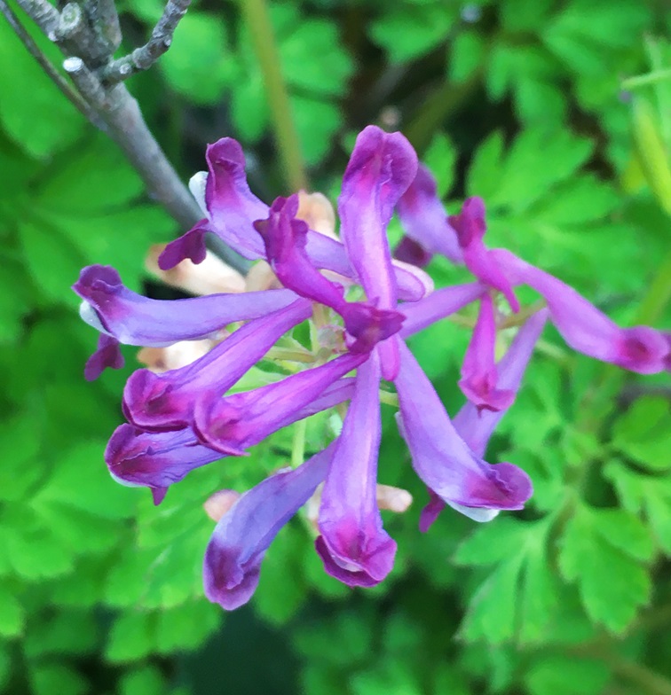 ホトケノザと同じ頃に咲き、仲間だと思われがちなのがムラサキケマンです。ムラサキケマンの花は、ラッパのような筒状の形をしています。ホトケノザの花と見比べると、違いがわかります。