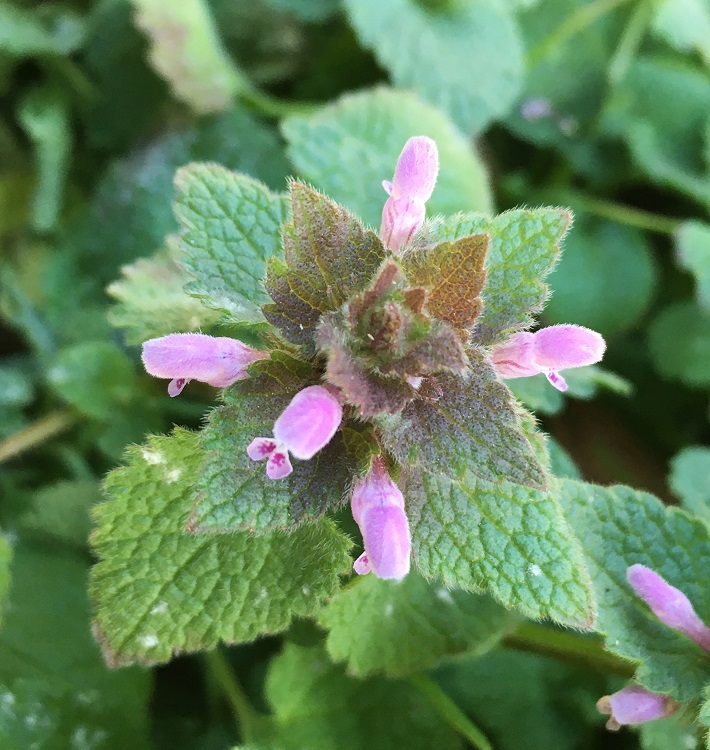 春先に咲く草花で、ホトケノザと似ていて、間違えられてしまうのが「ヒメオドリコソウ」。どちらもシソ科です。在来種のオドリコソウより目につくのは、外来種のヒメオドリコソウです。道端で淡いピンク色の花が鮮やかに群生しています。