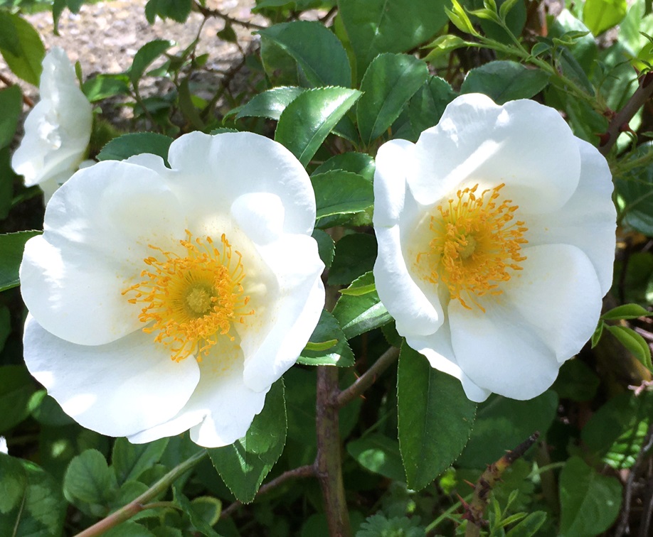 春にそのダマスクローズが道端でたくさんの花をつけ、香りを放っていたのを昨年記しましたが、今年もたくさんの花が開いていて、周りには良い香りが漂っています。そのすぐ近くではナニワイバラも密に花がついて、満開です。