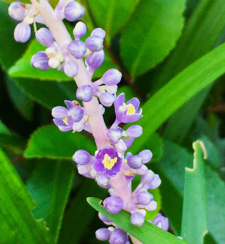 ヤブラン(藪蘭)はキジカクシ科ヤブラン属の多年草で、日本中に広く分布し、下草として自生しています。湾岸地域でも多用され、歩道脇などでよく見かけます。ヤブランは夏にジャノヒゲの花に似た紫色の花を咲かせます(画像)。今年もその花があちこちで咲き出しています。花が終わると、ヤブランは晩秋から冬に緑色、黒色のきれいな実を稔らせます。