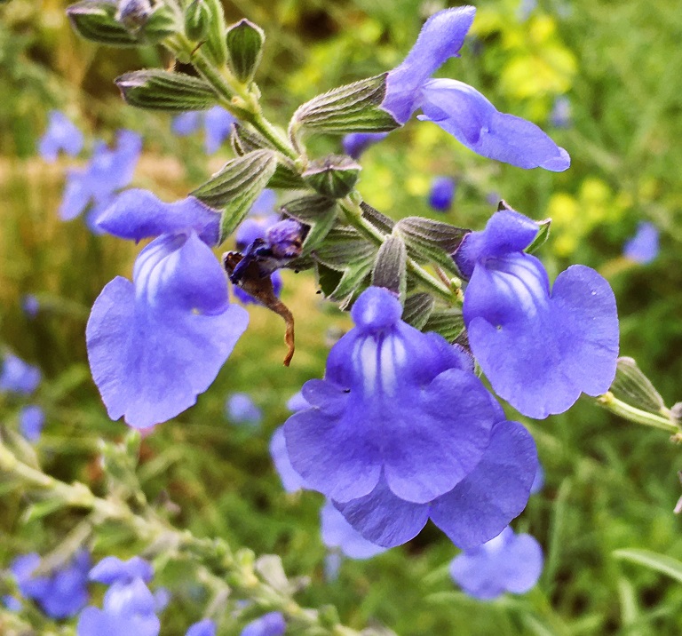 画像の三枚目からはサルビア・クレブランディ、サルビア・アズレア、サルビア・ガラニチカで、青紫色のグラデーションを見ているような気分になります。それらと異なるのが最後の画像のサルビア・ミクロフィラで、英名チェリーセージです。