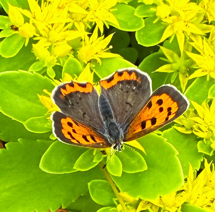 身近なシジミチョウの仲間でも空地のような環境があれば簡単に見られるのがベニシジミとヤマトシジミ。「蓼食う虫も好き好き」と言われるが、ベニシジミの幼虫はスイバなどタデ科のすっぱい植物だけを食べる。草地のシジミチョウは、雄が青、雌が黒い翅表をしたものが多いが、ベニシジミは雌雄ともに赤色である。鮮やかな赤と黒のコントラストは美しい。幼虫の体色には変異があり,全体緑色のものや紅色の線が目立つものなどがある(画像のベニシジミは春型メス)。